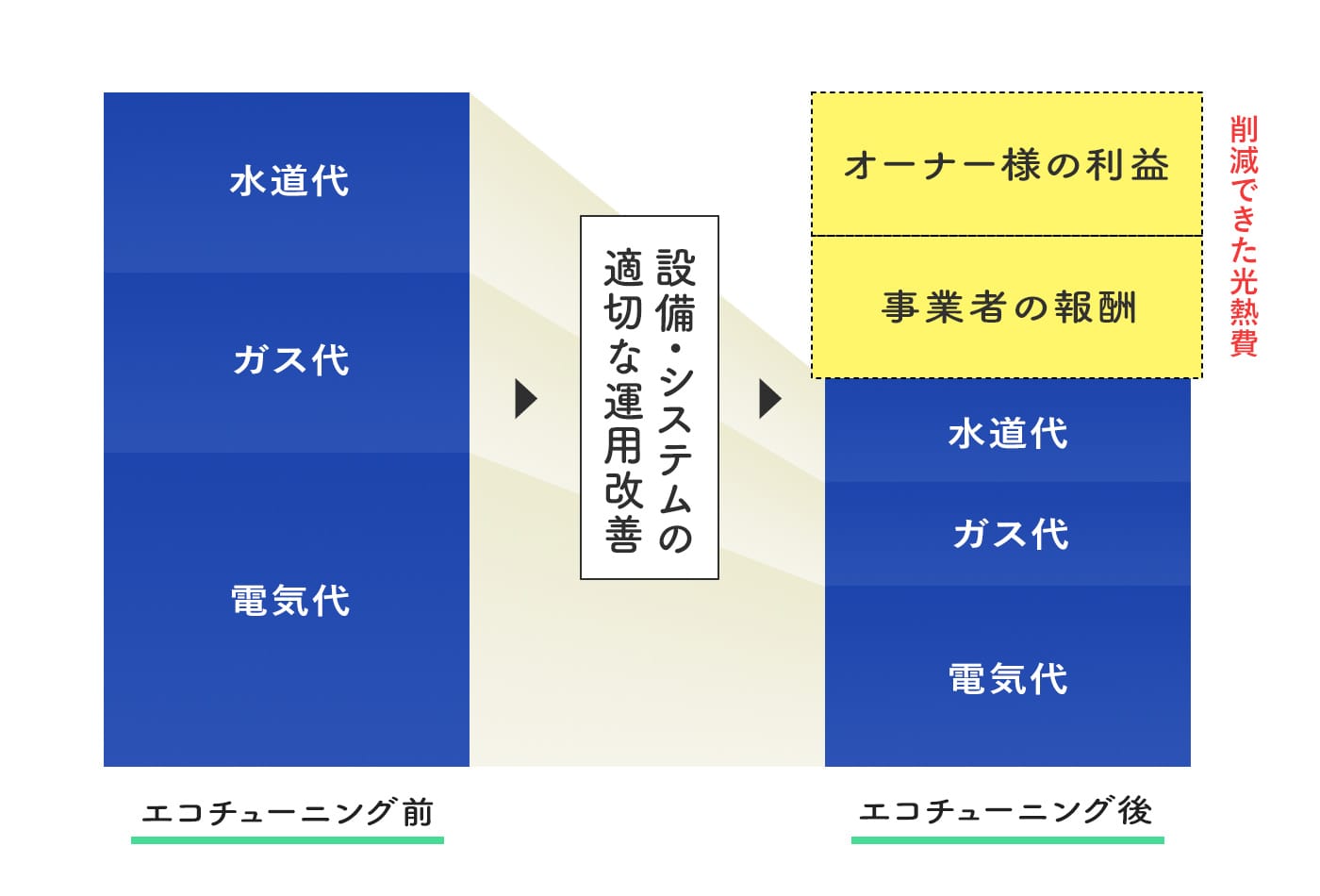 エコチューニング事業者への報酬は、主に光熱水費の削減額の中から一定割合を支払うため、削減ができなければ支払いは生じず、ビルオーナーにとって負担・リスクの少ないビジネスモデルです。